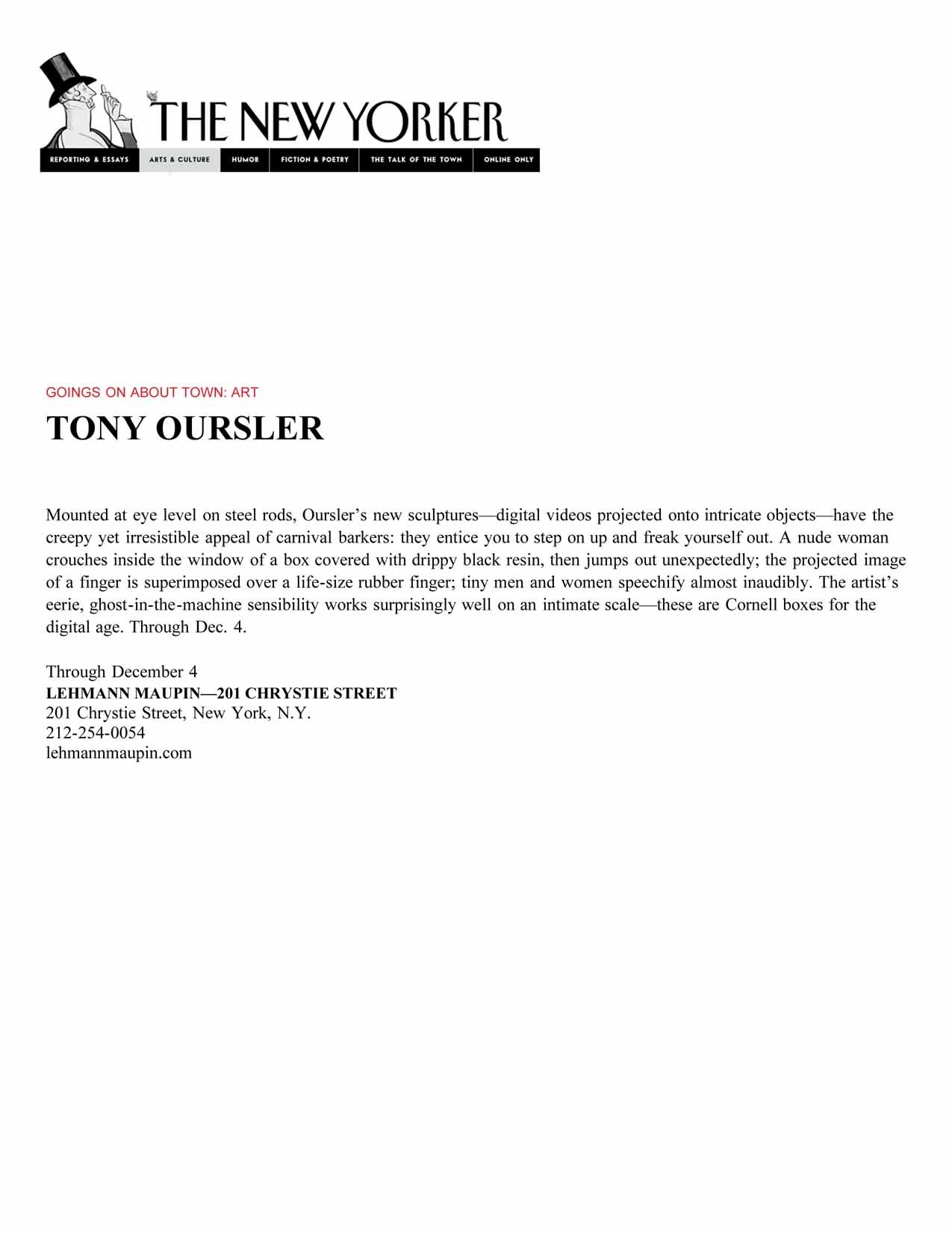 Mounted at eye level on steel rods, Oursler’s new sculptures—digital videos projected onto intricate objects—have the creepy yet irresistible appeal of carnival barkers: they entice you to step on up and freak yourself out. A nude woman crouches inside the window of a box covered with drippy black resin, then jumps out unexpectedly; the projected image of a finger is superimposed over a life-size rubber finger; tiny men and women speechify almost inaudibly. The artist’s eerie, ghost-in-the-machine sensibility works surprisingly well on an intimate scale—these are Cornell boxes for the digital age. Through Dec. 4.
