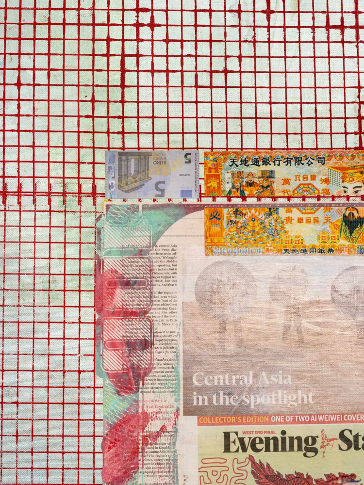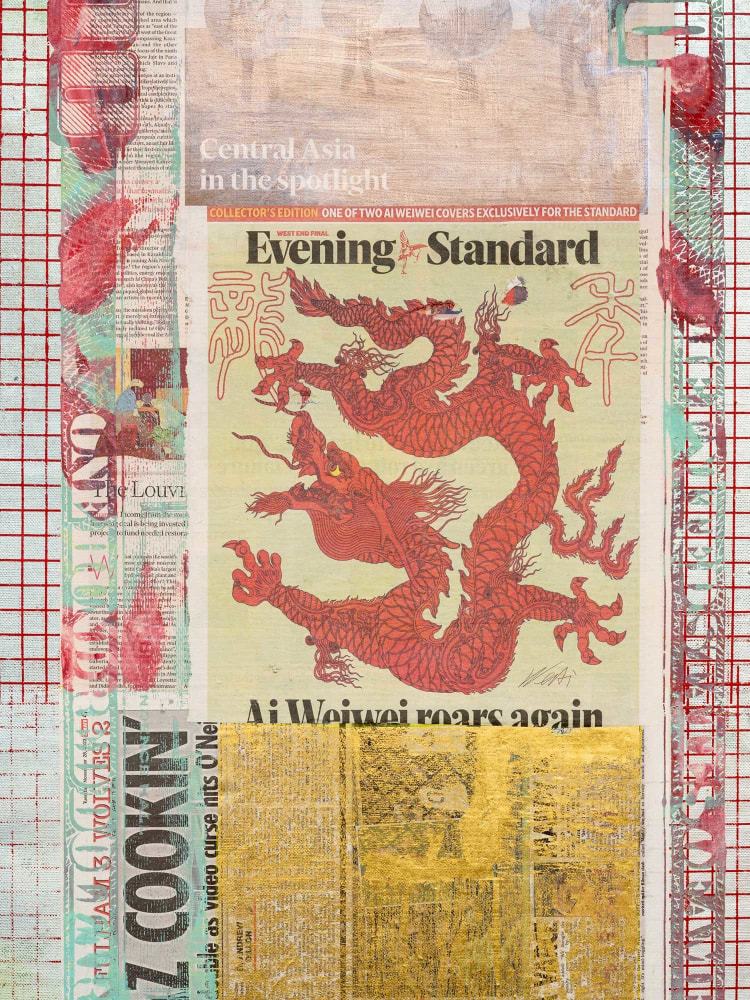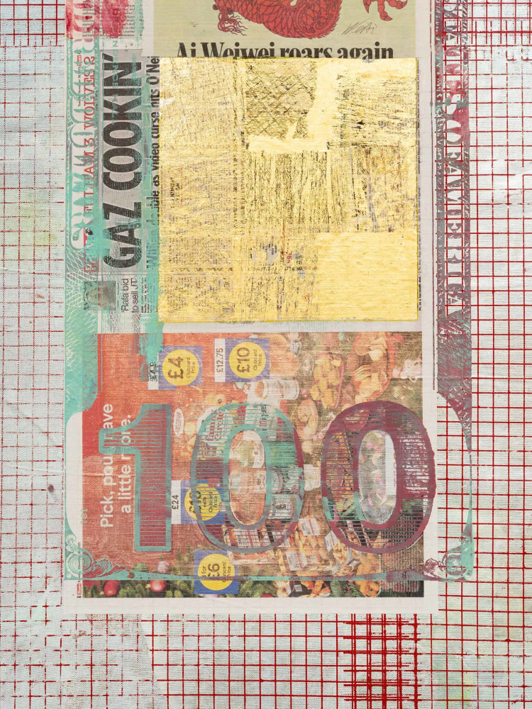 Oil and acrylic on linen with collaged and silkscreened elements, joss paper and gold leaf