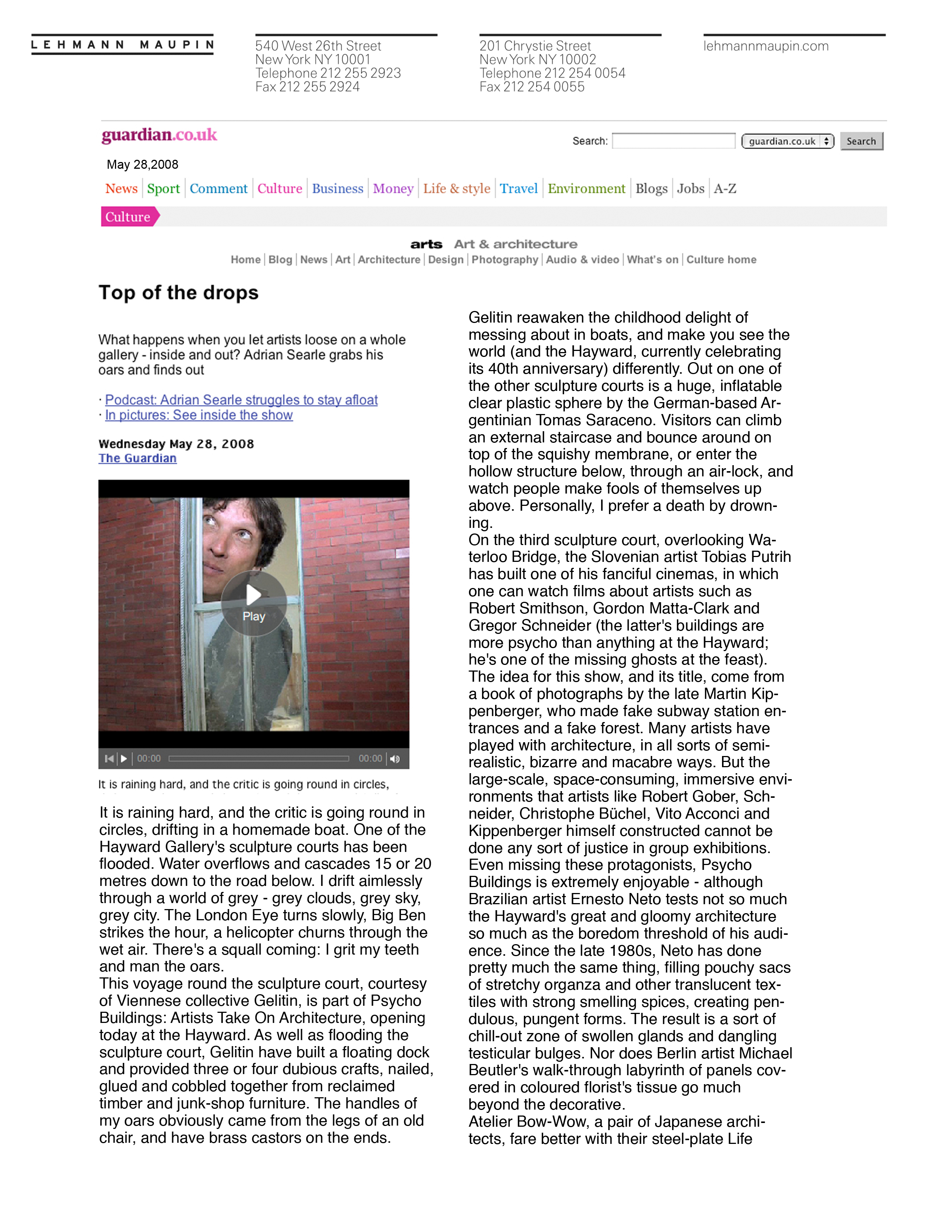 This voyage round the sculpture court, courtesy of Viennese collective Gelitin, is part of Psycho Buildings: Artists Take On Architecture, opening today at the Hayward. As well as flooding the sculpture court, Gelitin have built a floating dock and provided three or four dubious crafts, nailed, glued and cobbled together from reclaimed timber and junk-shop furniture. The handles of my oars obviously came from the legs of an old chair, and have brass castors on the ends.