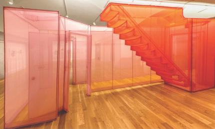 Eerie, shimmering structures rendered in ghostly fabric are Do Ho Suh’s signature. Two versions are on view at the Smithsonian American Art Museum, the artist’s East Coast debut. His “Hubs” include hallways and corridors from homes in three places where he’s lived (in Seoul, Berlin, and New York), depicted at scale in walk-through installations built in translucent fabric. So fine are the details in Suh’s recreated living quarters that it’s almost possible to read the signature on the inspection notice hanging in the hallway of the artist’s New York home, even though it’s all just stitching. Suh’s “Specimens,” on the other hand, are features separated from the whole—all the valves, switches, locks, and sockets that make up the domestic infrastructure of our lives.