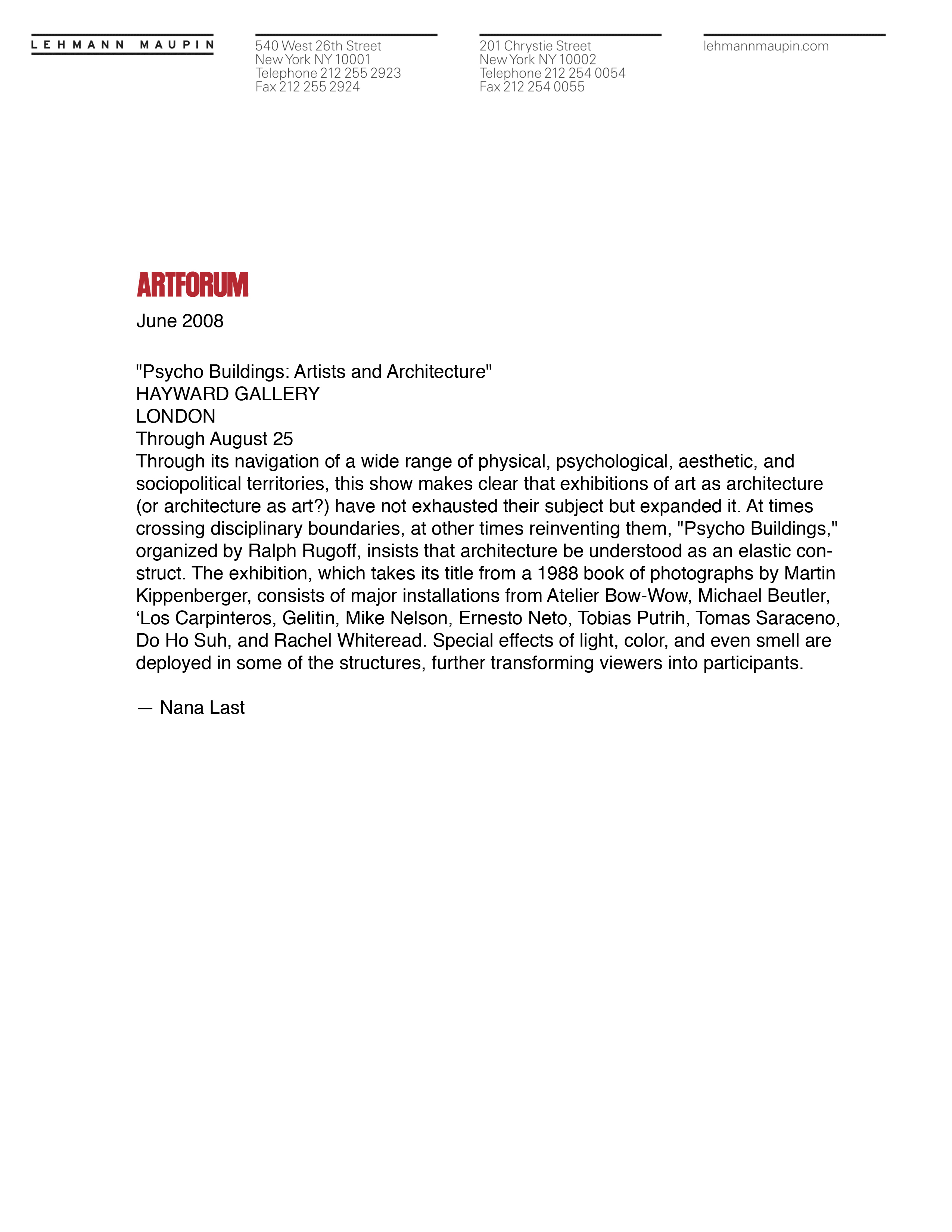"Psycho Buildings: Artists and Architecture" HAYWARD GALLERY LONDON Through August 25 Through its navigation of a wide range of physical, psychological, aesthetic, and sociopolitical territories, this show makes clear that exhibitions of art as architecture (or architecture as art?) have not exhausted their subject but expanded it. At times crossing disciplinary boundaries, at other times reinventing them, "Psycho Buildings," organized by Ralph Rugoff, insists that architecture be understood as an elastic construct. The exhibition, which takes its title from a 1988 book of photographs by Martin Kippenberger, consists of major installations from Atelier Bow-Wow, Michael Beutler, Los Carpinteros, Gelitin, Mike Nelson, Ernesto Neto, Tobias Putrih, Tomas Saraceno, Do Ho Suh, and Rachel Whiteread. Special effects of light, color, and even smell are deployed in some of the structures, further transforming viewers into participants.